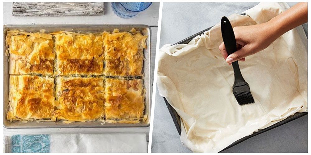 - ادهني طبق الفرن ورصي نصف الجلاش مع دهن كل ورقة بالزبدة ثم رصي العصاج وباقي كمية الجلاش بنفس الطريقة.