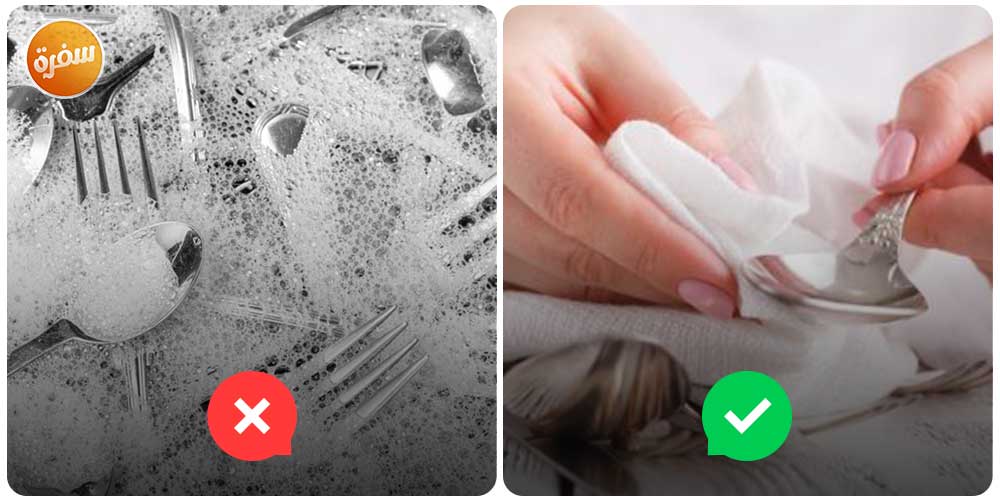 • تنظيف الفضة الملوثة، بالماء، يشوهها أكثر مما هي عليه، لذلك أفضل ما يمكنك فعله هو استخدام ملمع الفضيات.