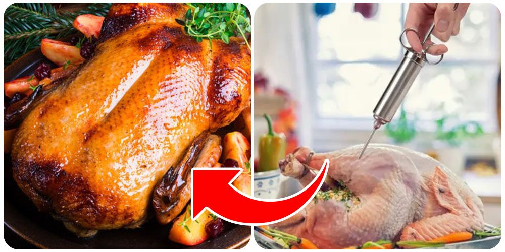 - يمكن وضع الديك الرومي في تتبيلة مركزة بدلا من الحقن في حال عدم توافر الحقنة، من خلال وضعه في طبق بلاستيكي كبير به مياه مخلوطة مع كوب ملح، ثم ينقع طوال الليل حتى نبدأ اليوم التالي في تتبيله خارجيا.