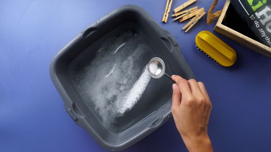 4. يضاف المسحوق لأحواض المياه حسب كمية المياه والملابس وحجم الحوض، ولكن لا يوضع أقل من ملعقة أو اثنتين في المياه حتى يمكن تنظيف الملابس جيدا، ومن الأفضل استخدام المنظفات السائلة لأنها تعمل بشكل أفضل مع الغسيل اليدوي وتذوب فورًا في الماء، ولكن يجب مزج المنظفات مع الماء باليد لمساعدتها على الذوبان وإنتاج الفقاعات والرغوة.