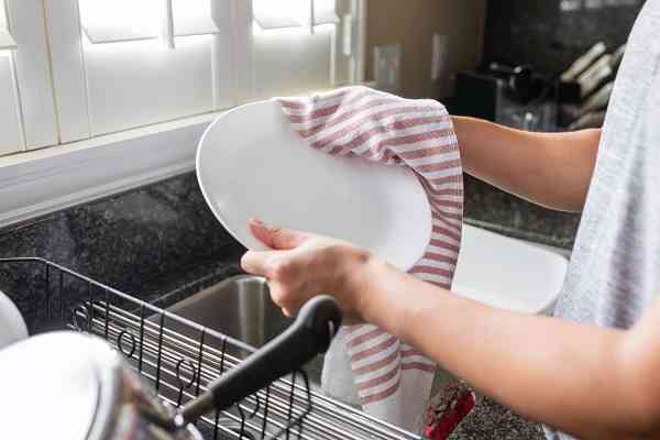 – تنقع الأواني بعد تنظيفها في مياه مغلية وصابون المواعين المضاف لها عصير الليمون مدة لا تقل عن ربع ساعة ثم تغسل مجدداً بالليفة والصابون وهو ما يزيل بقايا الدهون وكذلك الرائحة.