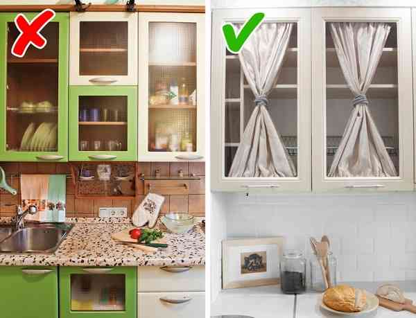 درف الزجاج في المطبخ من الأشياء التي تحتاج إلى إنفاق الكثير من المال لتغييرها ولكن هل تعلمي أنه هناك طريقة سهلة وبسيطة وتكلفة أقل ستجعل مظهرا أنيقا، من خلال إضافة الستائر بداخل درف الزجاج ما سيعطيها مظهرا أنيقا بالإضافة إلى إخفاء أدوات مطبخك عن الآخرين.