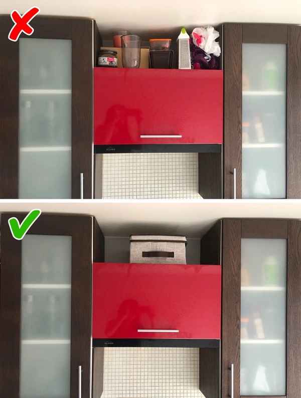 إذا كان لديك بعض المساحة بين خزائن المطبخ العلوية والسقف فربما تضع بعض من الأدوات هناك، وهو أمرا ليس سيئا لأنه يجب استخدام أي مساحة على أكمل وجه، ولكن إذا وضعت تلك الأدوات في صندوقا صغيرا على الرف فلن تصبح فوضوية وسيكون من السهل تنظيم المطبخ كما أنها ستحمي الأدوات من الاتساخ.