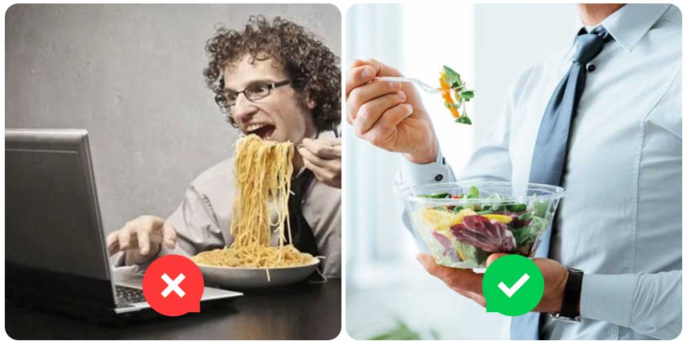 - الوجبة الرئيسة في العمل هي “الغداء”، حيث يجب أن تحتوي على عناصر مفيدة مثل البروتين والسكر والألياف والكربوهيدرات، وغيرها من العناصر الغذائية، حتى تجعلك قادرًا على تحمل ضغط العمل.